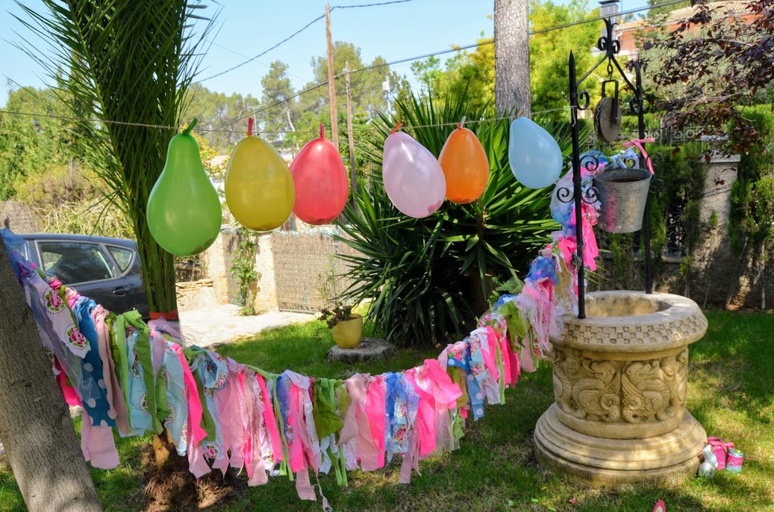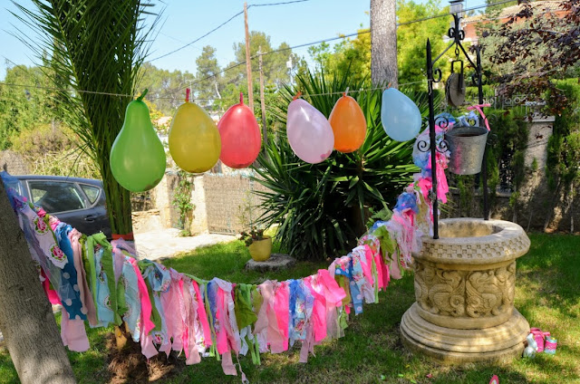 Había una zona en la que puse el banderín de nudos que preparé para el cumple y unos globos con confetti, el confetti también nos pirra!!!